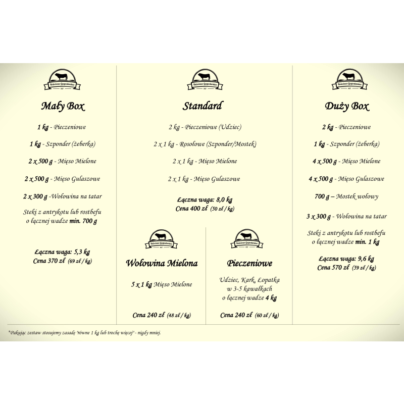 Sprzedaż wołowiny z naszego gospodarstwa jest sprzedażą cykliczną. Oznacza to, że odbywa się ona w określonych terminach (mniej więcej co 2-3 tygodnie), a dostępny w niej asortyment to mięso pozyskane z jednej, dwóch lub maksymalnie trzech sztuk bydła. Tusza wołowa zawiera wiele elementów zróżnicowanych pod względem cech i wartości, a ilość niektórych z nich jest bardzo niewielka. Aby zachować równomierność w sprzedaży poszczególnych elementów, a także pozwolić, aby każdy klient miał możliwość skosztowania tych najtrudniej dostępnych, zaproponowaliśmy obowiązkowy wybór jednego z naszych boxów mięsnych. Do wyboru jest aż 5 boxów, zawierających zróżnicowane i wygodnie porcjowane kawałki. Po wybraniu z boxa instnieje możliwość wybrania dodatkowych porcji mięsa z naszego sklepu.